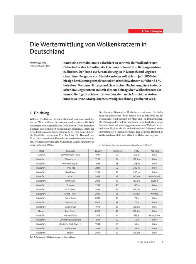 FRANKFURT, GERMANY, December 29, 2022 /24-7PressRelease/ -- The German expert magazine GuG (Grundstücksmarkt und Grundstückswert) has published in its current issue 6/2022 an expert article by Ronny Kazyska on the valuation of skyscrapers in Germany. The professional journal "Der Immobilienbewerter" had previously presented contents of the new professional book by Ronny Kazyska with the title "Die Wertermittlung von Wolkenkratzern in internationalen Märkten" (The valuation of skyscrapers in international markets). The professional contribution in the current issue of GuG 6/2022 focuses in detail on the German market. It contains content not part of the book on the international valuation of skyscrapers.