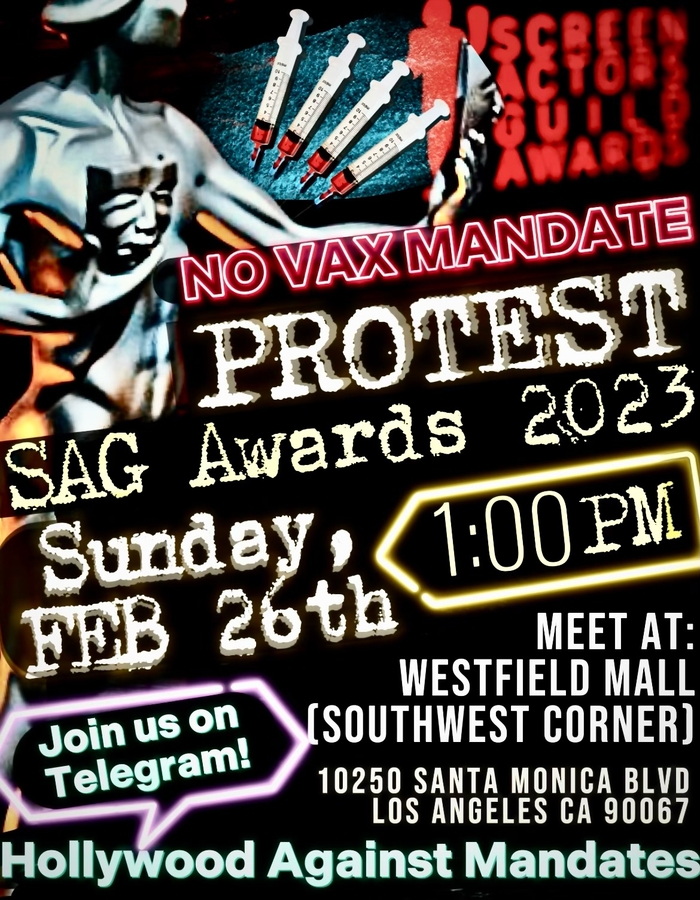 LOS ANGELES, CA, February 24, 2023 /24-7PressRelease/ -- SAG-AFTRA and other entertainment Union Members from across the country opposed to the film and TV industry's vaccination mandate say they will stage a protest in SOLIDARITY this coming Sunday November 26th. Protesters are said to gather peacefully outside the Sag Awards Show in Los Angeles at 10250 Santa Monica Blvd. Los Angeles, CA 90067 1:00pm sharp.