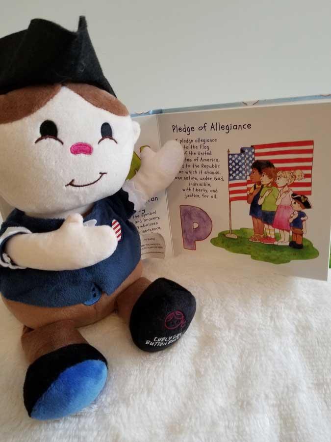 The 12-inch Patriot Buddy plush toy contains a voice module and recites the Pledge of Allegiance when you place his right hand on his heart and push. The companion book, "ABC America, Land that I Love" is a toddler board book featuring the new Patriot Buddy that includes patriotic songs, images and the "Pledge of Allegiance". Each gift set also includes a handheld American flag.