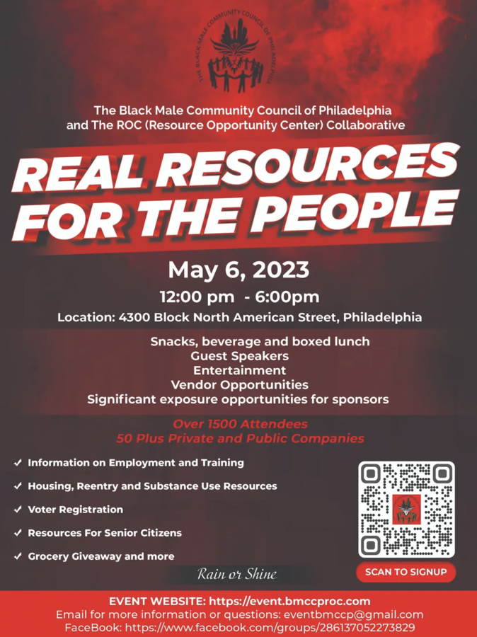 The ROC Collaboration is a group of 25 businessmen and leaders committed to providing services to meet the needs of men, women and children in the Philadelphia area. We are expecting over 1500 attendees at this event, which will feature 50 resource tables from 50 private and public organizations. Those in attendance ages 18 & over will have access to a plethora of resources including grocery giveaways by the Philadelphia Sheriff's office, Household supply giveaways by Uncle Chase Foundation.