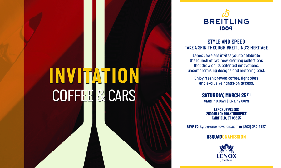 Breitling has a deep history of innovation along with their long-standing connection to automobiles as well. Precision and efficiency along with ultimate style is shown in every design of watches produced by this incredible brand. Lenox Jewelers is excited for a fun morning on March 25 to experience these brand new collections by Breitling in their Fairfield, Connecticut.
