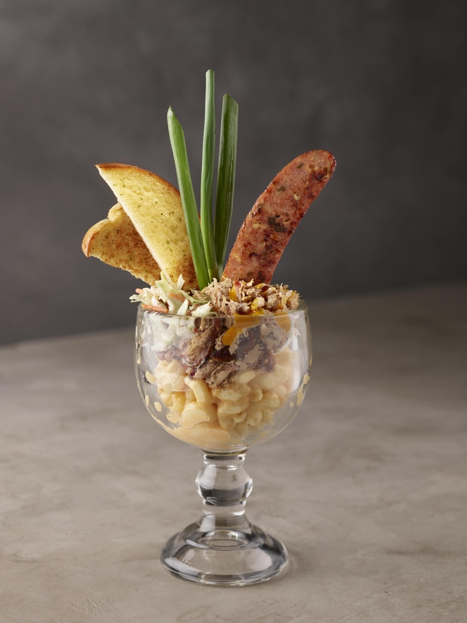· Pulled Pork Sundae – Layers of house smoked pulled pork, three cheese mac & cheese, jalapeno cheddar sausage and creamy bacon coleslaw, topped with garlic bread, green onion and Carolina BBQ sauce. ($11.99)