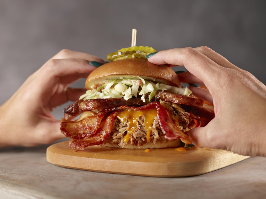 · Three Little Pigs Sandwich – House smoked pulled pork, smoked pork belly and crispy bacon topped with Carolina BBQ sauce and bacon slaw on a toasted brioche bun and garnished with pickle slices. ($14.99)