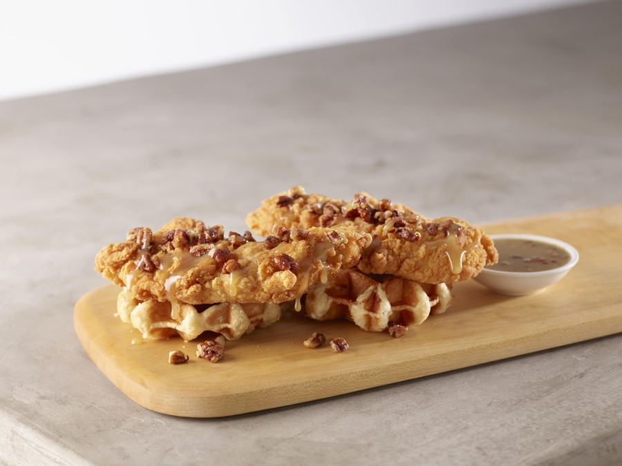 Chicken & Waffles – Two crispy jumbo chicken tenders paired with two Belgium waffles and topped with candied pecans and house made honey pecan butter. ($17.99)