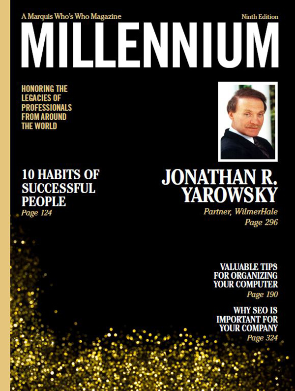 WASHINGTON, D.C., April 03, 2023 /24-7PressRelease/ -- Jonathan R. Yarowsky, partner at WilmerHale, has been selected for a cover feature in the Ninth Edition of Marquis Millennium Magazine. Released triannually, Millennium Magazine features the narrative biographies of the world's most esteemed and accomplished professionals. The publication is available exclusively to Marquis listees, and inclusion is by invitation only.