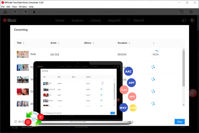 4kFinder YouTube Music Converter supports a wide range of audio formats, including MP3, M4A, AAC, WAV, FLAC and AIFF. After launching the program and login with your YouTube Music account, then choose a output format you need in the setting interface, simply drag a album or the entire playlist for adding it to the converting list and select music tracks you want to download, and the program start music conversion in 10X speed.