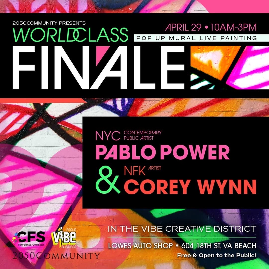 VIRGINIA BEACH, VA, April 19, 2023 /24-7PressRelease/ -- 2050Community artist collective in partnership with its new non-profit Comforting Future Self, both of the ViBe Creative District of Virginia Beach are hosting NYC contemporary public artist Pablo Power April 28-30th for a mural painting and celebration of the finale of 2050Community's "World Class" project, at Lowe's Auto Repair located on 18th Street in the ViBe Creative District. Pablo was a mentor to the international class of 4 emerging artists which included Norfolk interdisciplinary visual artist Corey Wynn. The artists assisted in the concept and design of art and garden installations across three underserved locations affected by conflict, war and extreme poverty in Africa and the Middle East. Pablo and Corey will paint the final mural together during the Something in the Water festival, Saturday & Sunday. The two artists share a synergy and love for transforming images influenced by music and social culture with underlying commentary and common ground. Visitors are encouraged to greet the artists and watch them paint on Saturday between 10am-3pm.