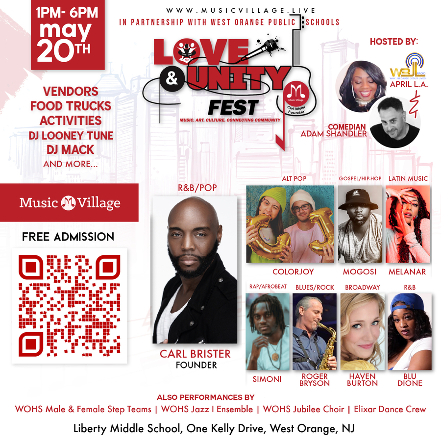 The Week of Love+Unity culminates with The 8th Annual Love+Unity Fest, on Saturday, May 20th, from 1-6pm at Liberty Middle School, One Kelly Drive, West Orange, NJ. It's free for the community with food trucks, activities, cultural art, and vendors. Musical guests include Haven Burton (Broadway), Roger Bryson (Rock/Soul), Melaner (Latin), Colorjoy (Alt-Pop), Blu Dione (R&B), Mgosi (Gospel/Hip-Hop), Simoni (Afrobeats/Hip-Hop), Elixar Dance Crew, West Orange High School's Jazz I Ensemble, Jubilee Choir, and Male & Female Step Teams. Taking the stage for the finale' performance will be Love+Unity Fest Founder, Carl Brister who will perform his current R&B single "Let's Wait Awhile" as well as debut a new "Country" music single "…Will Be Spring Again". He adds, "I've always enjoyed singing different styles of music. It's what The Love+Unity Fest is all about - seeing beauty in the diversity in music, the arts, and amongst each of us."