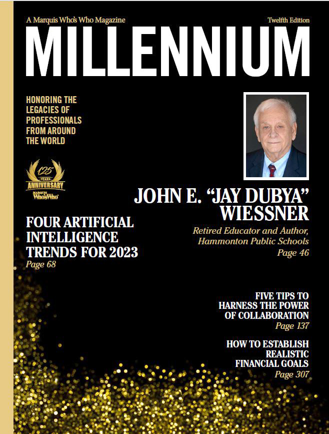 HAMMONTON, NJ, June 05, 2023 /24-7PressRelease/ -- John E. "Jay Dubya" Wiessner, author and retired educator from the Hammonton Public Schools, has been selected for a cover feature in the Twelfth Edition of Marquis Millennium Magazine. Released triannually, Millennium Magazine features the narrative biographies of the world's most esteemed and accomplished professionals. The publication is available exclusively to Marquis listees, and inclusion is by invitation only.