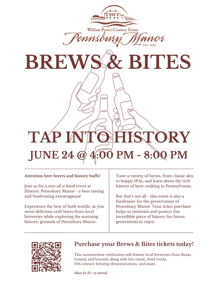MORRISVILLE, PA, June 16, 2023 /24-7PressRelease/ -- The historic Pennsbury Manor today announced it is preparing for a large crowd of visitors at this year's annual Brews & Bites fundraising event scheduled for June 24th. This one-of-a-kind event will feature craft beer tastings from breweries in Bucks County and beyond, the region's favorite food trucks for tasty eats, and live music from 4-8 p.m. Attendees will also be treated to 17th Century brewing demonstrations live on the beautiful grounds of Pennsbury Manor on the banks of the Delaware in Bucks County.