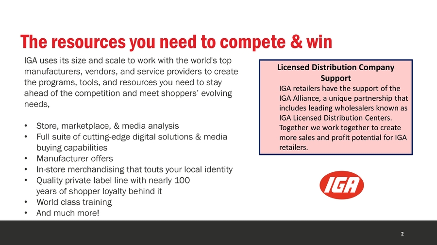 The Independent Grocers Alliance (IGA) was founded in 1926 to bring family owned, local grocery stores together under the IGA brand. Nearly a century later, the support of a nationally known brand is still giving IGA grocers the ability to better compete, while at the same time, allowing them to stay true to who they are—hometown store owners in a position to meet the needs of their unique communities. Learn more at IGA.com.