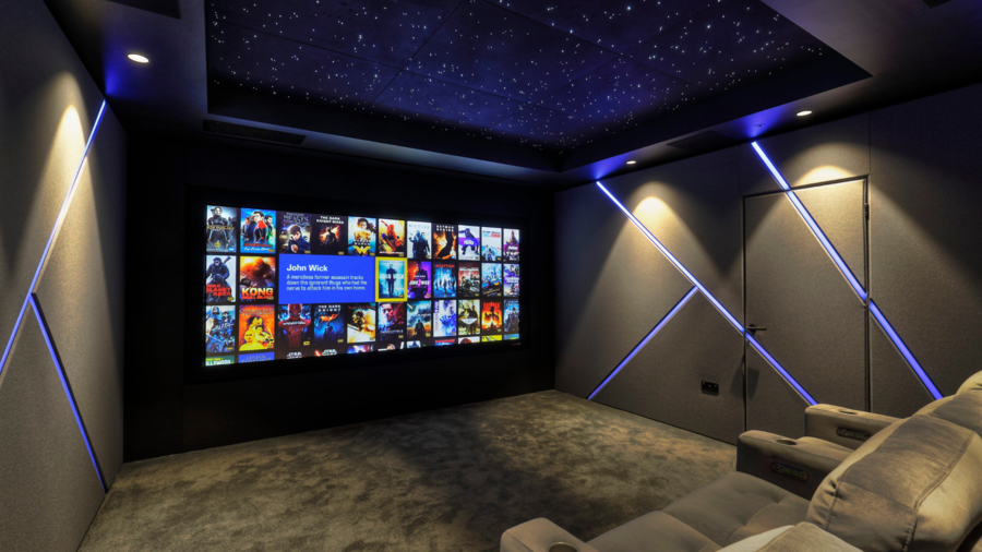 A dedicated home cinema comprises a 7.1.4 Dolby Atmos system with speakers from the Triad Gold range and the projection and screen system from Sony and Screen Research respectively. In addition, the room has been acoustically treated with fabric wrapping, fabric starlight ceiling and home cinema seating.