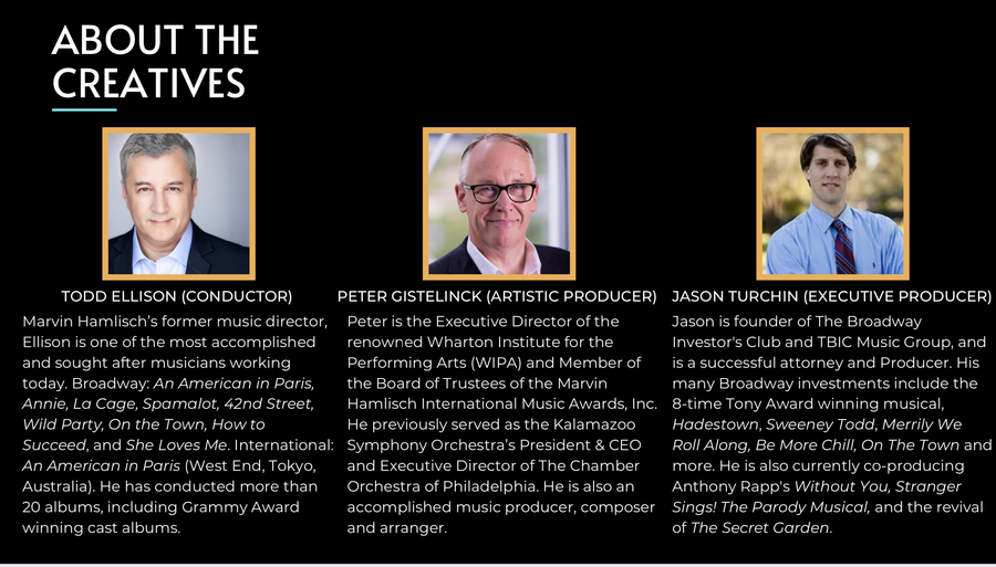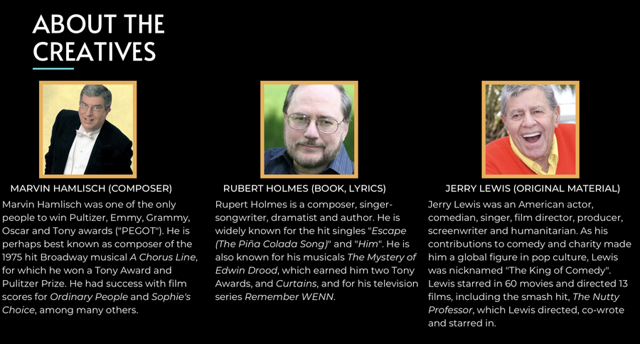 In addition to Turchin, the production team consists of Artistic Producer Peter H. Gistelinck (Belgian/Dutch/German productions of Jesus Christ Superstar, Grease, My Fair Lady, Little Shop of Horrors, Playmate), with music by Marvin Hamlisch, lyrics by Rupert Holmes, and Music Director/Conductor Todd Ellison (An American in Paris, Annie, La Cage, Spamalot, 42nd Street), in association with Terre Blair-Hamlisch and Jerry Lewis Films, Inc. The cast will be announced at a later date, along with the album's release expected for spring 2024, which is also the 80th birthday celebration year of Marvin Hamlisch.