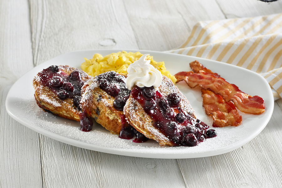 - Blueberry Muffin French Toast Platter: Our own Blueberry Mammoth Muffin® is sliced and dipped in French Toast batter, grilled and topped with a warm blueberry topping, whipped topping and powdered sugar. Served with two eggs and choice of two Applewood smoked bacon strips or two sausage links.