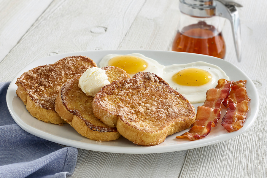 - Cinny'Min French Toast Platter: Three slices of our luscious French Toast dusted with cinnamon sugar, served with two eggs and choice of two Applewood smoked bacon strips or two sausage links.