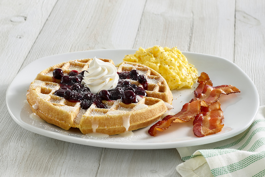 - Lemon Blueberry Waffle Platter: Our own Belgian Waffle with blueberry topping and a lemon cream cheese drizzle. Finished with whipped topping and powdered sugar. Served with two eggs and choice of two Applewood smoked bacon strips or two sausage links.