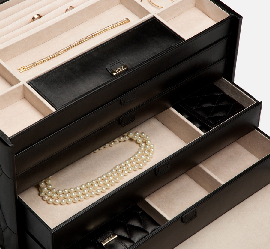 WOLF products make for exceptional gifts, especially for the watch or jewellery collector that takes the upkeep of their fine pieces seriously. Their watch winders allow one to, at once, keep watches wound to ensure they are always prepped for wear, as well as keep them safe in a fashionable and protective container. WOLF also produces watch and jewellery boxes in sumptuous green velvet as well as black, ivory, and green leathers, that allow one to store their valuable accessories in style. Customers at Damiani Jewellers can additionally browse this brand's jewellery storage and travel cases. These products allow travellers to safely transport and display their valued accessories with full confidence.