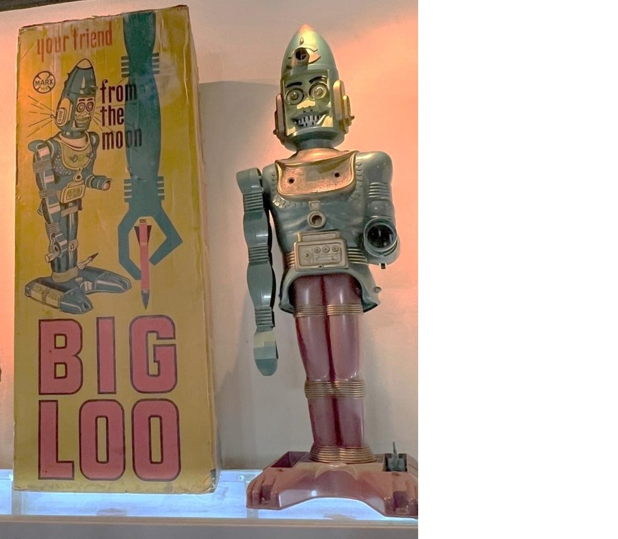 Manufactured by Louis Marx and Company for the 1963 holiday season, Big Loo had a limited production of about 5,000, making this guy quite rare. Described by the catchphrase of "Your Friend From the Moon," Big Loo was one of the largest toy robots made, with a height of more than 38 inches. The elaborate design and attention to detail on Big Loo is truly remarkable. A rocket-firing launcher with two rockets operates from his base. Battery operation controls his flashing red eyes, and Big Loo can turn his head, roll forward, take a bow, launch balls, shoot darts, squirt water with his "water ray," and grasp objects with his spring-operated hand. He speaks 10 phrases and can even send messages in Morse code, using the clicking mechanism on his back. Big Loo's "sonic signal" hard plastic whistle is on the back of his head, and between his feet is a working compass.