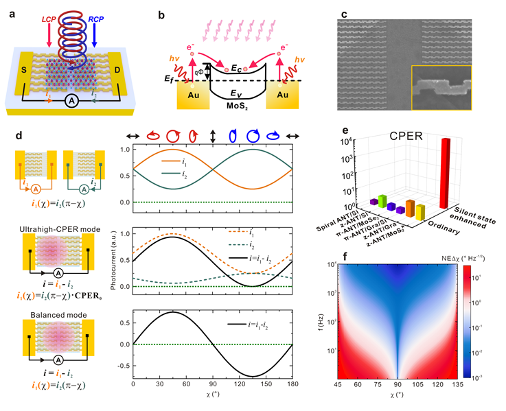 The silent state enhanced on-chip infrared circular polarization detector exhibits an ultrahigh circular polarization discrimination ability in the experiment. In fact, the output value of actual test equipment cannot be absolutely zero, and the down limit is the noise (inoise), Therefore, the CPER is redefined as the ratio of the photoresponse under LCP (main polarization) illumination to the noise under RCP (Polarization states that need to be shielded) illumination. As shown in Figure 2, for the ultra-high CPER mode, taking into account the ambient noise and equipment noise, the authors redefine CPER as a function not only of the wavelength but also of the modulation frequency of the incident light. In the ultra-high CPER mode, considering the noise from environment and equipment, the CPER is related to the wavelength and the modulation frequency of the incident light. When the modulation frequency exceeds 1 kHz, the CPER value exceeds 104. In the balanced mode, the optoelectronic silent state was set at the horizontal and vertical linear polarization, showing ultrahigh sensitivity to light ellipticity change. The noise equivalent light ellipticity difference goes below 0.009° Hz−1/2. It is noted that the device working in the balanced mode also exhibits excellent anti-common-mode noise ability.