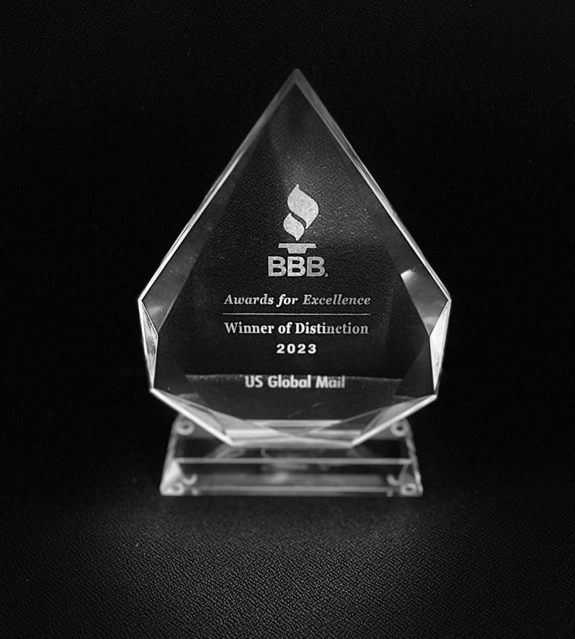 HOUSTON, TX, November 09, 2023 /24-7PressRelease/ -- The Better Business Bureau's accolade is a testament to US Global Mail's unwavering commitment to excellence, customer engagement, and corporate citizenship. The prestigious recognition was conferred during a ceremony on October 12th at Houston's Bayou City Event Center—a city of particular significance to US Global Mail as its birthplace and a hub of its operations.
