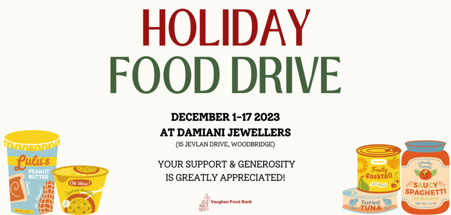 Damiani Jewellers is dedicated to their community of Woodbridge and are happy to partner with Vaughan Food Bank for this important cause. Contact Damiani's Woodbridge jewellery store or give them a call at (905)850-4653 to learn more about the food drive and their selection of fine jewellery or professional services.