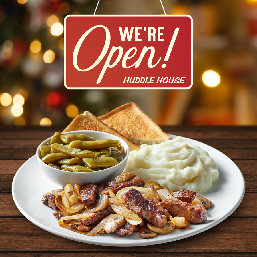 On Christmas Day, Huddle House will continue to serve their Big House Breakfasts, Sweet Cake Platters, Homestyle Dinners, and more favorites.