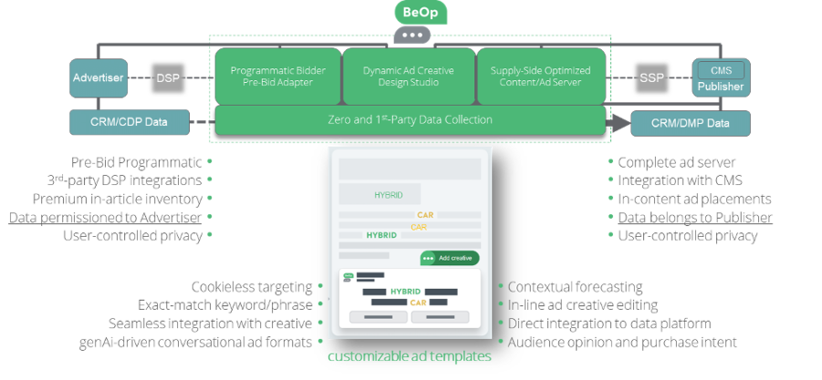 BeOp Generative Content is an genAi-based technology extension that allows publishers and advertisers to automatically generate ad content that invites users to respond and interact. This feature relies on advanced algorithms that understand market trends, user preferences, and ad campaign objectives and other data to create highly-engaging content with conversational flow. The new solution addresses the challenges of discerning users' interests to formulate relevant questions and answers, making it an invaluable tool for campaign performance and success. The launch release uses ChatGPT, and BeOp can enable customers to plug in any other genAi of their choosing.