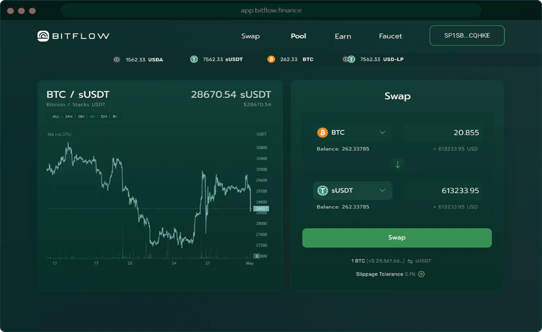 BitFlow is a decentralized exchange that leverages the security, capital, and network of Layer 1 Bitcoin. BitFlow makes it easy for BTC liquidity to flow, so that users can trade for any token defined in the Bitcoin ecosystem. The protocol replaces middlemen with smart contracts and decentralized liquidity pools so that Bitcoiners can an auto-compounding BTC yield.