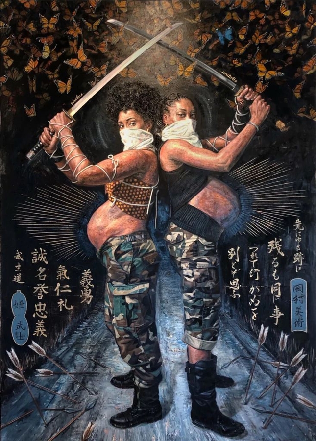 All of Ferguson's curating work is based on legal theory. In 2015 she curated What's Inside Her Never Dies at her Miami gallery to address how Black women are often typecast as pillars of strength. More recently she thought, "what if there was this group of women who took the charge to defend the defenseless, this band of women who would come into battles and fight oppression." She and the artist, Tim Okamura, discussed the possibility at length. "I am helping Tim tell the story. He masters the imagery. These women are taking the charge and trying to bring back the balance in society." Work began in 2014 and continued all through the pandemic, as did their conversations. They landed on a theme of the Onna-Bugeisha or Japanese female warrior. "When Tim started this series, it was a time when totalitarian political scenarios became possible," says Ferguson of the years leading up to the election of Donald Trump. "We were feeling powerless as a society to stop what was actually taking place."