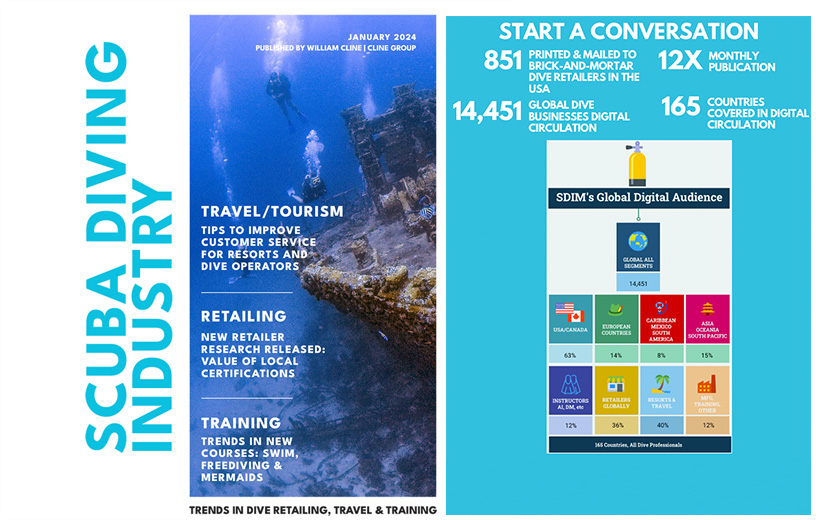Scuba Diving Industry Magazine's circulation is very unique and the ONLY dive trade publication to reach every dive shop in the USA plus a global digital circulation of over 14,400 in 165 countries, all dive trade not consumer (B2B).