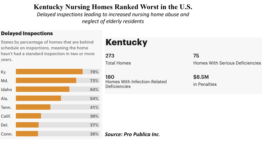 LOUISVILLE, KY, February 08, 2024 /24-7PressRelease/ -- U.S. nursing home inspection data released by ProPublica reveals that Kentucky nursing homes are ranked as the worst in the U.S. for overdue inspections, meaning these facilities haven't undergone a standard inspection in two or more years. 79% of all Kentucky nursing homes are overdue for inspections.