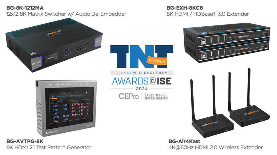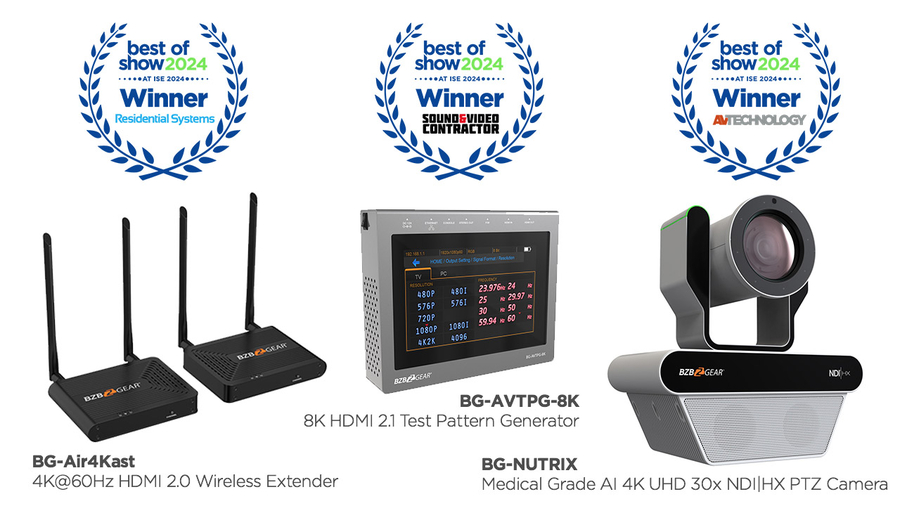 BZBGEAR's latest line of 8K and 4K solutions along with their new medical-grade PTZ camera all made quite the impression at ISE 2024. BZBGEAR was recognized for seven total awards: four from Commercial Integrator and CE Pro's Top New Technology Award and three from Future's Best of Show Award.