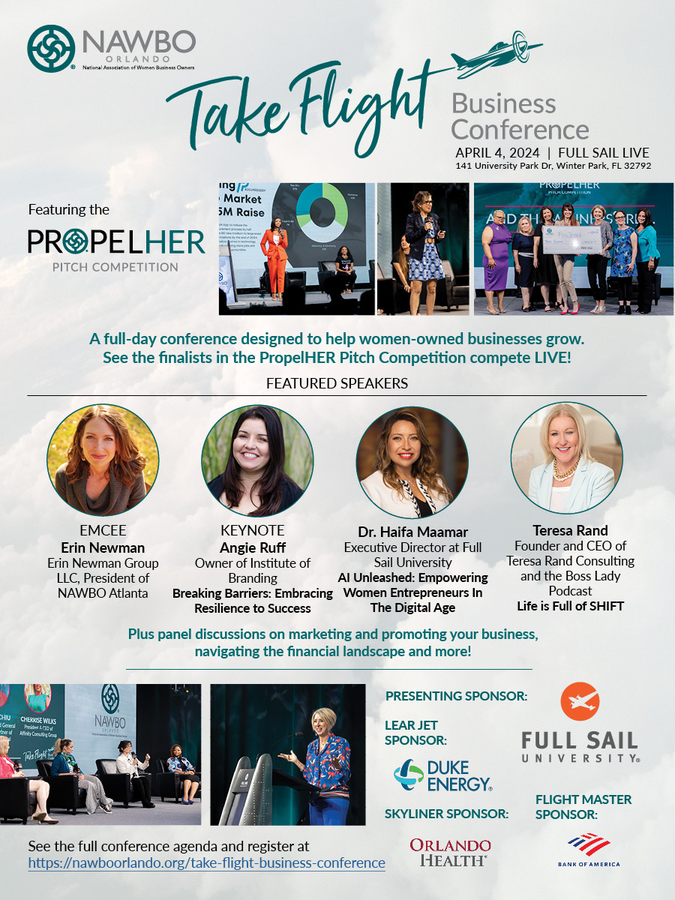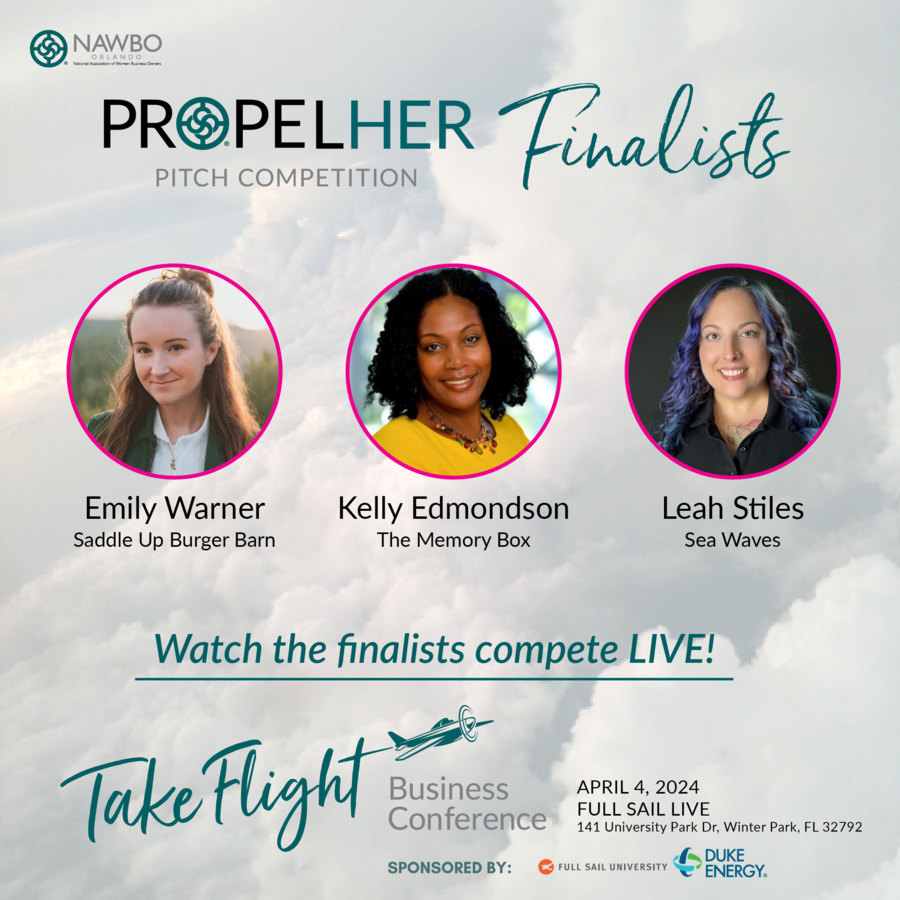 ORLANDO, FL, March 21, 2024 /24-7PressRelease/ -- The Orlando Chapter of the National Association of Women Business Owners (NAWBO) is thrilled to announce the finalists for the esteemed PropelHER Pitch Competition. This event is set to be a highlight at the upcoming annual Take Flight Women's Business Conference, scheduled for April 4, 2024, at Full Sail University's Live Venue, located at 141 University Boulevard in Winter Park, Florida. This event is made possible by Full Sail University and Duke Energy.