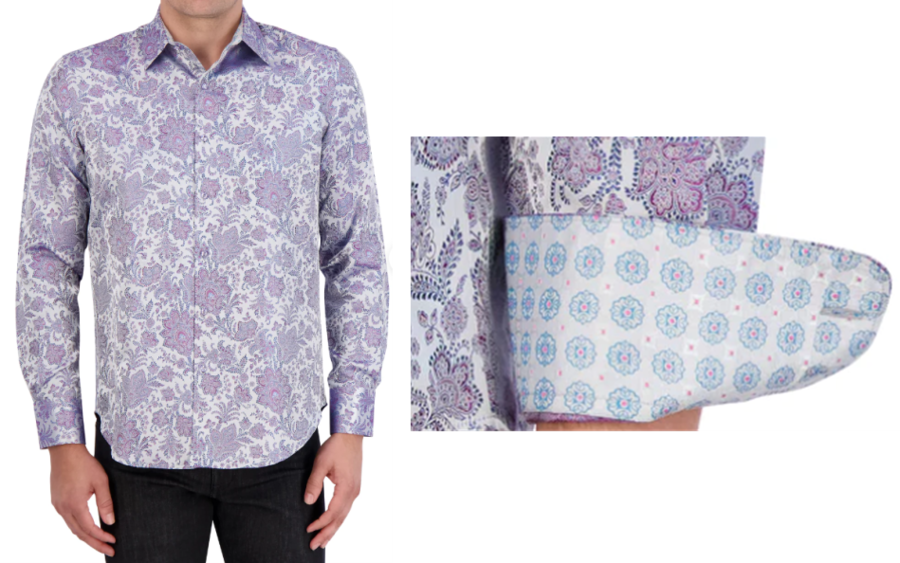 The Portiere is available in a color choice of light blue or purple (shown below), and features a shirttail hem and point collar. Another hallmark of Robert Graham designs is the contrasting print fabric on the shirt cuffs. Combining prints is not for the faint of heart, and not everyone gets it right. It's safe to say that Robert Graham undoubtedly has mastered this.