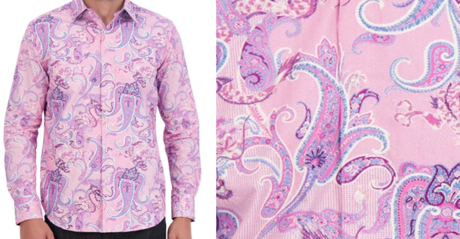 The designer describes its newest limited edition shirt, The Goody Long-Sleeve Button-Down Shirt, as "inspired by Tête de Bélier, the iconic pink diamond owned by European royalty, this rose-hued style is a true gem. Paisley overlays on mixed-textured fabric bring forth accents of tonal metallic embroidery and jacquard trims to bring subtle luxury to this blazer. Notice the tonal dragons in the background. The cut crystal glass buttons' dazzle gives the final touches and a nod to the blaze's original jeweled inspiration."