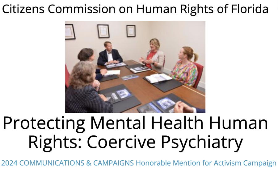 CLEARWATER, FL, April 06, 2024 /24-7PressRelease/ -- The Florida chapter of the Citizens Commission on Human Rights (CCHR) was one of four finalists in the 2024 Impact Communications Awards in the category of Activism. Competing with entries from organizations across the country, CCHR was recognized for their work to protect mental health human rights and to address coercive psychiatry. [1]