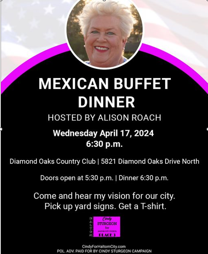 "We want to hear from you. What are your thoughts on Haltom City? What can we do better? What improvements would you like to see?" asked Drabik. This dinner event is your chance to enjoy some good food and talk directly with the candidates. RSVP on Cindy's campaign website.