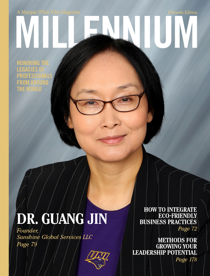 CEDAR FALLS, IOWA, April 25, 2024 /24-7PressRelease/ -- Dr. Guang Jin, founder of Sunshine Global Services LLC, has been selected for a cover feature in the Fifteenth Edition of Marquis Millennium Magazine. Released triannually, Millennium Magazine features the narrative biographies of the world's most esteemed and accomplished professionals. The publication is available exclusively to Marquis listees, and inclusion is by invitation only.