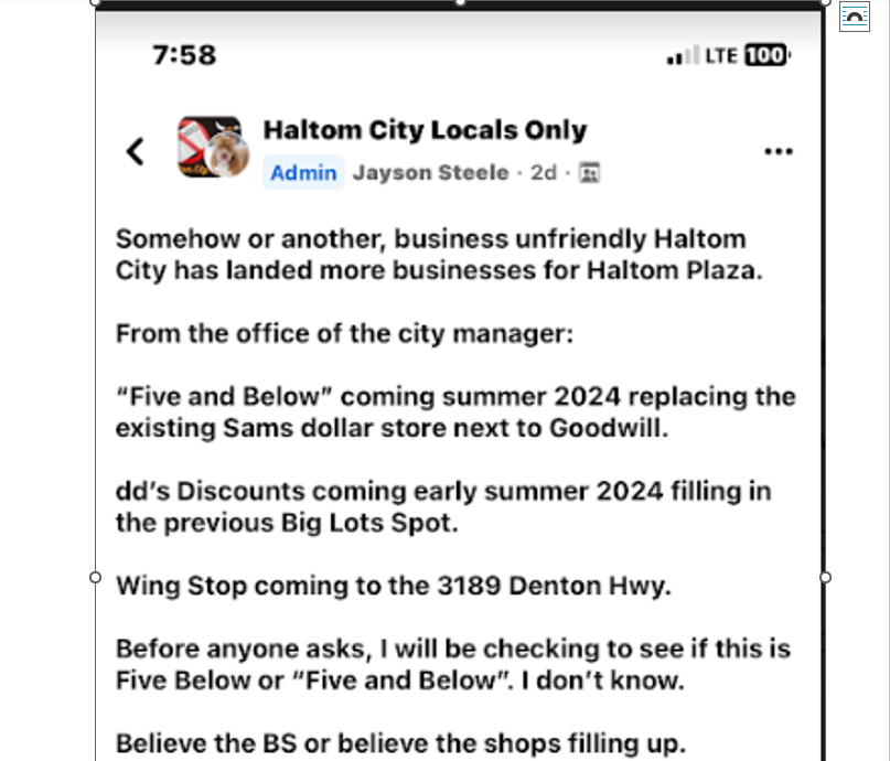 HALTOM CITY, TX, July 09, 2024 /24-7PressRelease/ -- In a recent post on Facebook, Haltom City employee Jayson Steele reported on new businesses coming to Haltom City. In that post, he stated that Sam's Dollar Store next to Goodwill had gone out of business as had Big Lots.