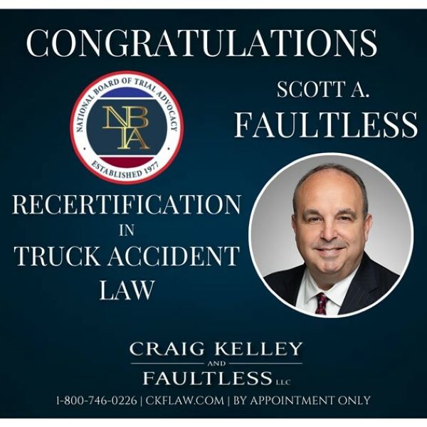 INDIANAPOLIS, IN, May 24, 2024 /24-7PressRelease/ -- Craig, Kelley & Faultless, a nationally recognized personal injury firm, is proud to announce that Scott A. Faultless, a founding member and partner of the law firm, has successfully achieved recertification for the next five years as a truck accident law advocate which is awarded by the National Board of Trial Advocacy (NBTA) and accredited by the American Bar Association (ABA). Board certification conveys that an attorney has done the extra work to be certified in a specific legal field. At the time of Scott's recertification, only seventy-four (74) attorneys were board-certified in truck accident law by the NBTA.