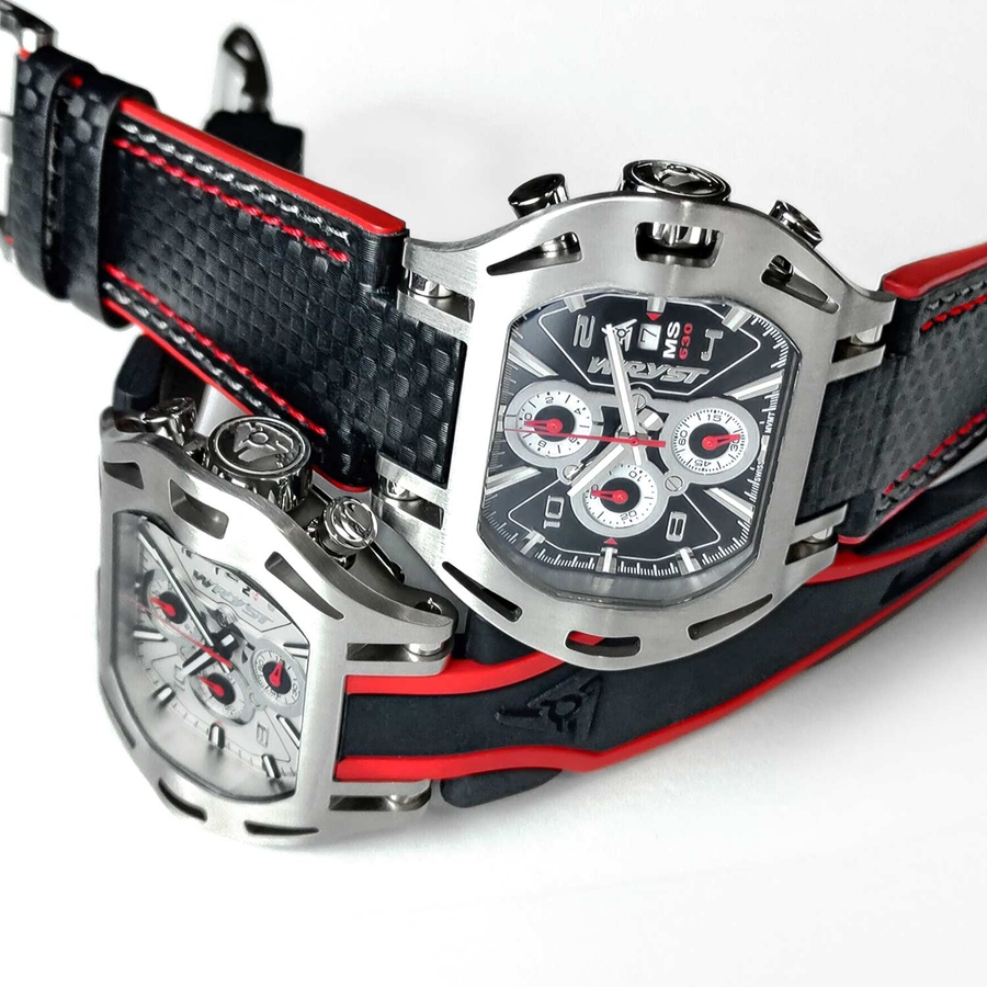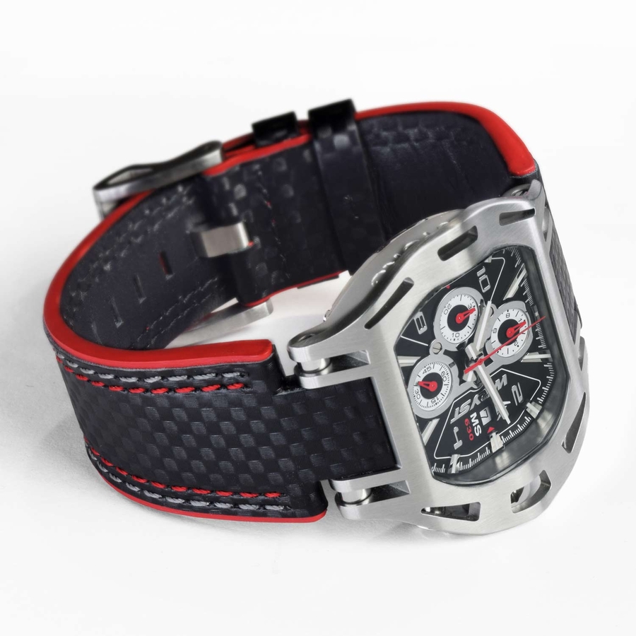The luxury mens watches Wryst Motors MS630 model has a black carbon fiber leather strap. The chequered pattern of this stylish strap, along with red-color over stitching and reddish edges, was inspired by the world of automobile sports.
