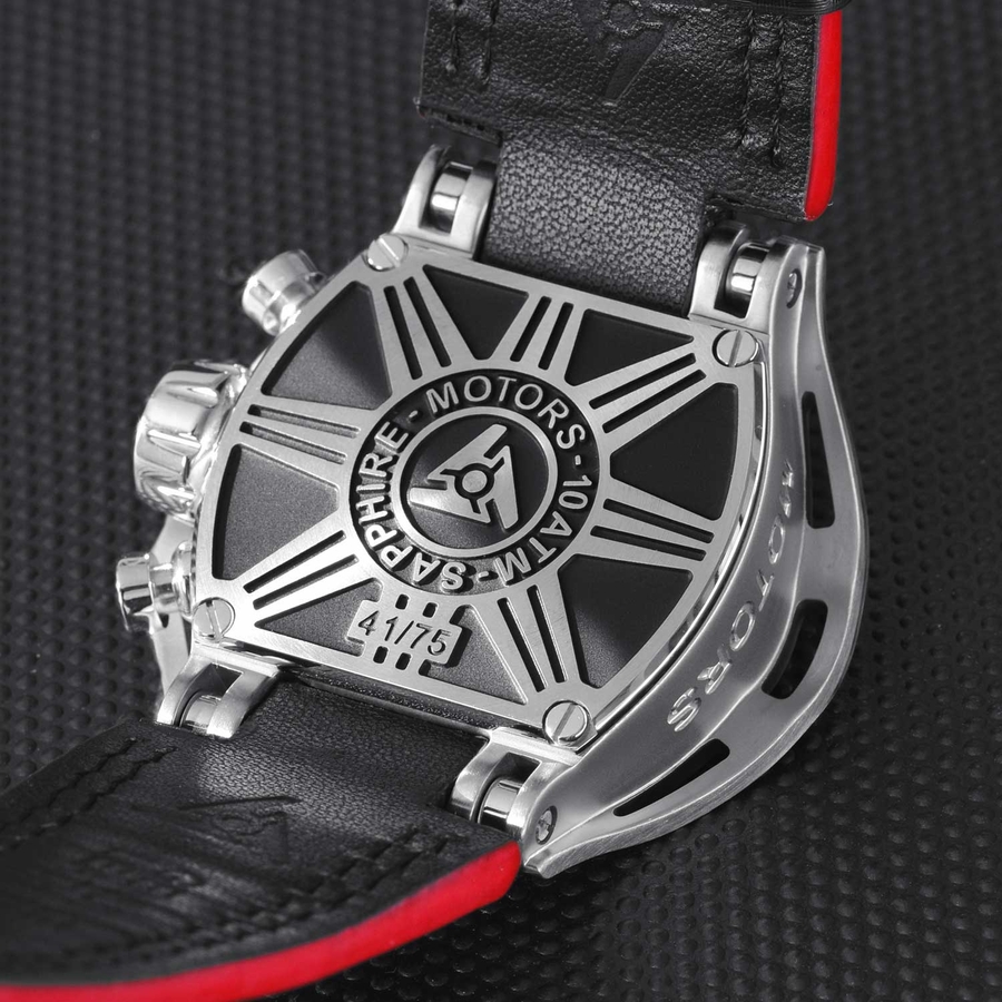 The rear side of the case is equally brilliant as its face. Crafted from solid stainless steel and secured to the main case structure with four screws, it evokes sports car alloy wheels with spokes. The alternative steel and black finishings enhance the depth of the design. The crown at 3 o'clock is a screw-in type and ensures remarkable water resistance up to 100 meters/10 ATM.