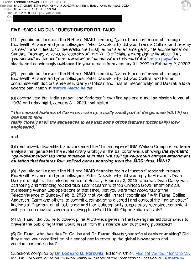 According to Dr. Horowitz, five 'smoking guns' are obviously exposed by reviewing Dr. Fauci's e-mails, 'inner circle' correspondence, and obvious panic the weekend of January 31, 2020 to February 2, 2020, when the Director of the NIH's National Institute for Allergies and Infectious Diseases (NIAID) urgently organized "damage control" over published science proving COVID-19's lab creation contained HIV/AIDS genes as the primary 'gain-of-function' infection trigger for the bioweapon.