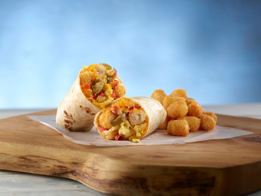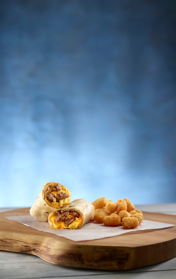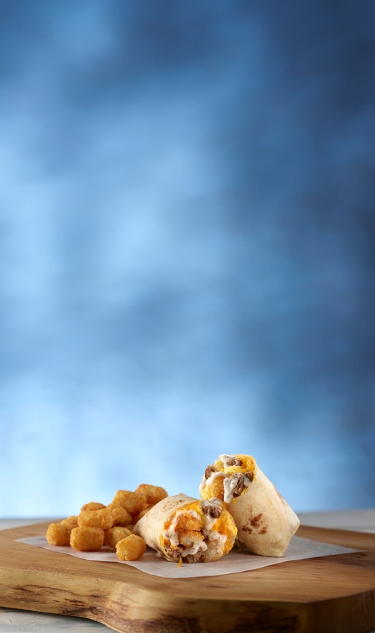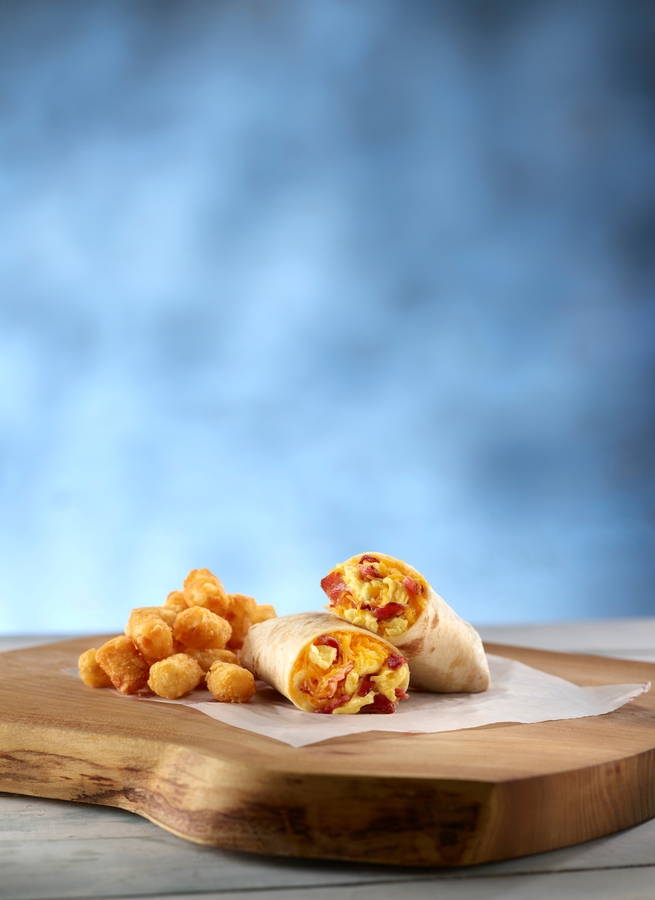 Triple Meat Locker Burrito: This meaty sensation is packed with Applewood smoked bacon, savory country sausage, tender diced ham, farm-fresh scrambled eggs, crispy tater tots, and melted cheddar cheese.