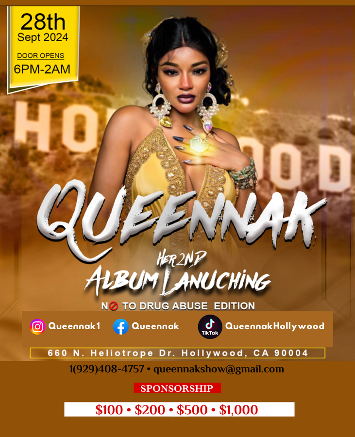 Join us for Queennak's highly anticipated second album launch concert, themed "No To Drug Abuse Edition." This exclusive event will take place in the heart of East Hollywood and promises an unforgettable evening of music, entertainment, and networking opportunities. We are excited to offer various sponsorship packages and promotions that will not only enhance your concert experience but also provide valuable exposure for your business or organization. Read on to learn more about each package and how you can be a part of this exceptional event.