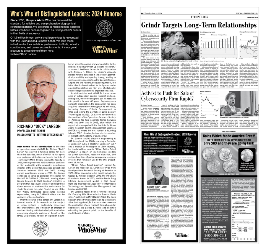 LEXINGTON, MA, June 28, 2024 /24-7PressRelease/ -- Richard "Dick" Larson of the Massachusetts Institute of Technology was selected by Marquis Who's Who for a prominent feature in the New England Edition of The Wall Street Journal on June 27, 2024.
