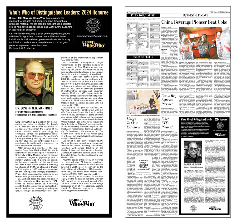 ALBUQUERQUE, NM, June 28, 2024 /24-7PressRelease/ -- Dr. Joseph G. R. Martinez was selected by Marquis Who's Who for a prominent feature in the Southern California Edition of The Wall Street Journal on February 28, 2024.