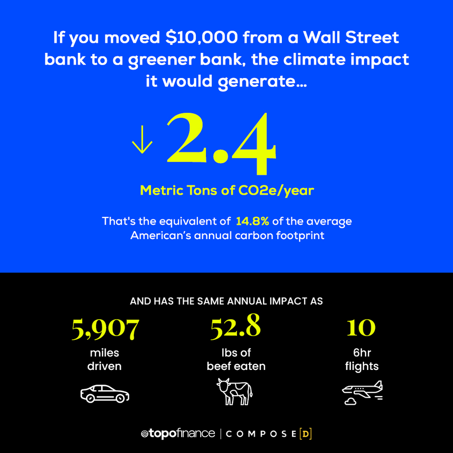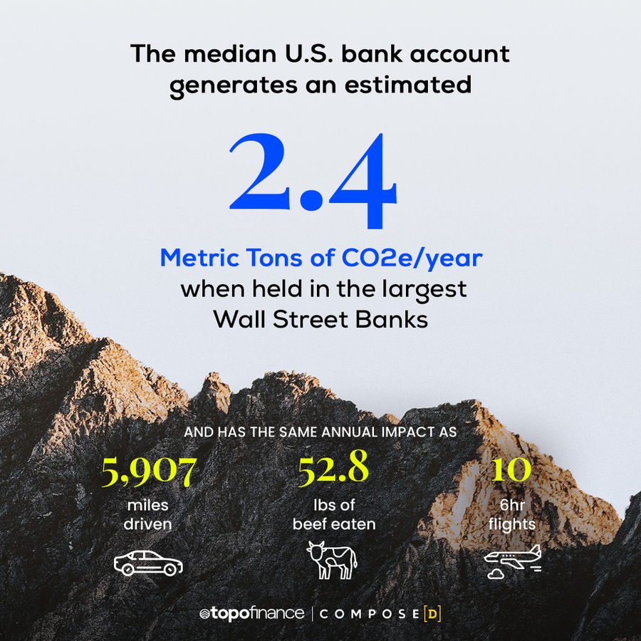 "Exercising agency over how our banks lend and invest our money is perhaps the single most effective consumer action individuals can take to effect systemic impact," said Jason Parkin, founder, president, and chief creative officer at Compose[d]. "That's why we were excited to partner with Topo Finance and build a tool that enables individuals to understand the climate impact of their banking and embrace this accessible, low-cost, and powerful climate action."