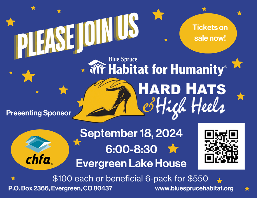 EVERGREEN, CO, September 05, 2024 /24-7PressRelease/ -- Blue Spruce Habitat for Humanity, the local foothills affiliate of Habitat for Humanity International, is excited to announce its annual Hard Hats & High Heels fundraiser on Wednesday, September 18, 2024, at the beautiful Evergreen Lake House. Doors open at 6:00 PM, and guests will enjoy an evening of drinks, food, live music, a silent auction, and a live auction—all in support of affordable housing for low-income families in our mountain communities. Together, we are making our communities stronger.