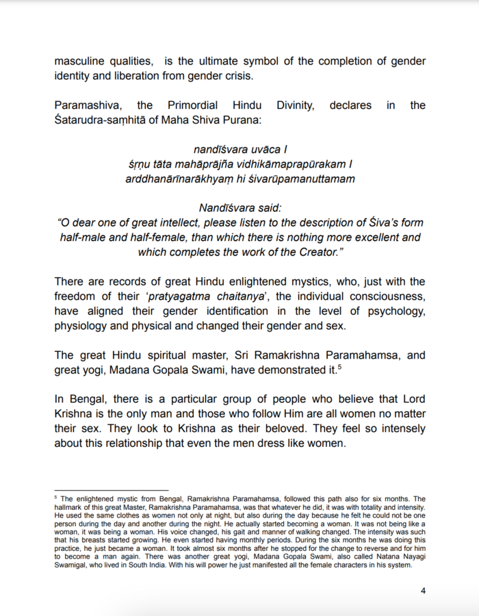 Citing Hindu scriptural references from the Śvetāśvatara Upaniṣad, Srimad Bhagavatam, and Manusmriti, the report illustrates how Hindu traditions have long embraced non-binary and fluid gender identities.